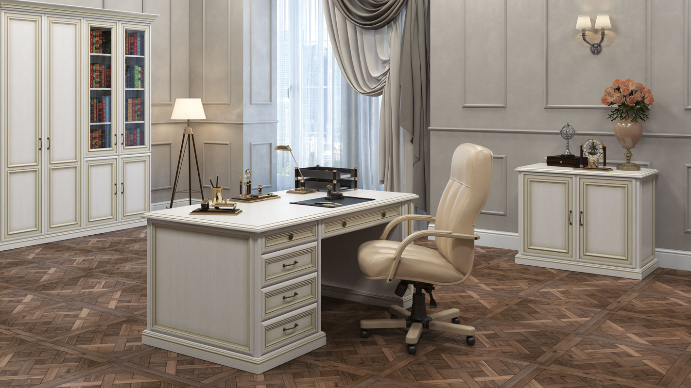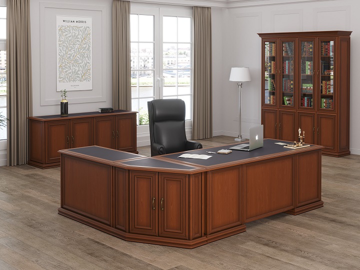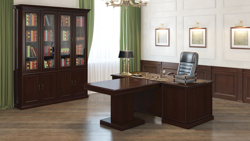 Tao cottoКабинет руководителя Oxford – эстетически безупречный гарнитур, выполненный в классическом стиле. Массивный письменный стол, незаменимая брифинг-приставка и практичная креденция, красивый стол для переговоров, внушительных размеров тумба под ТВ и просторные шкафы для деловой документации – каждый элемент создает особую атмосферу успешности бизнеса и респектабельности.